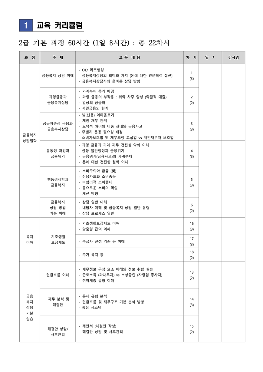 신용카드사회공헌재단. 롤링주빌리가 함께하는 금융복지상담사 양성과정 커리큘럼